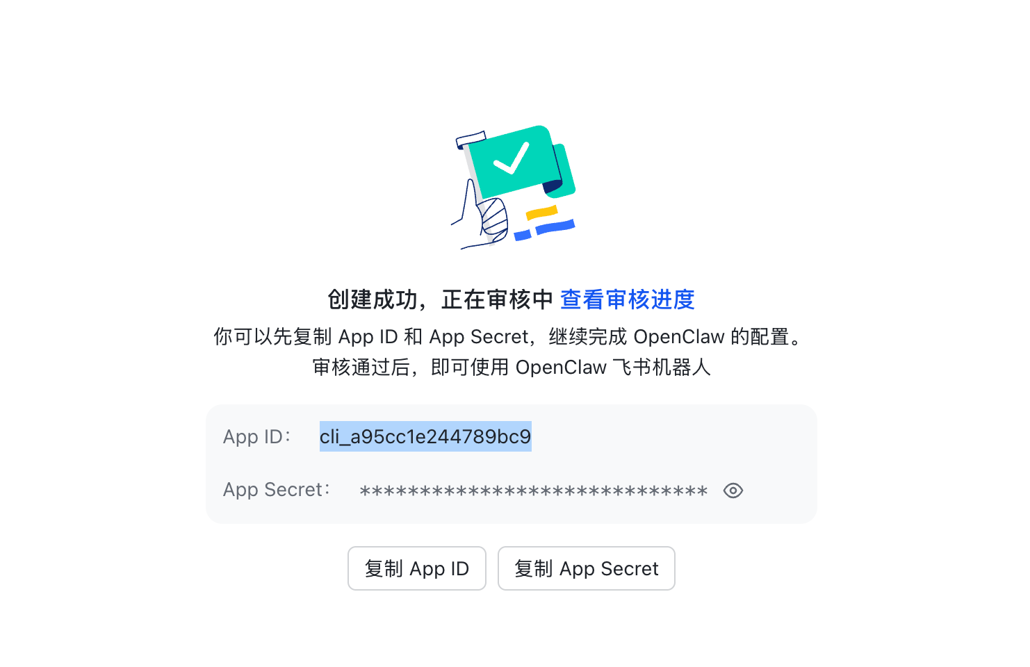 创建好后,记得复制AppId和AppSecret,并且去到飞书客户端进行审核机器人通过。