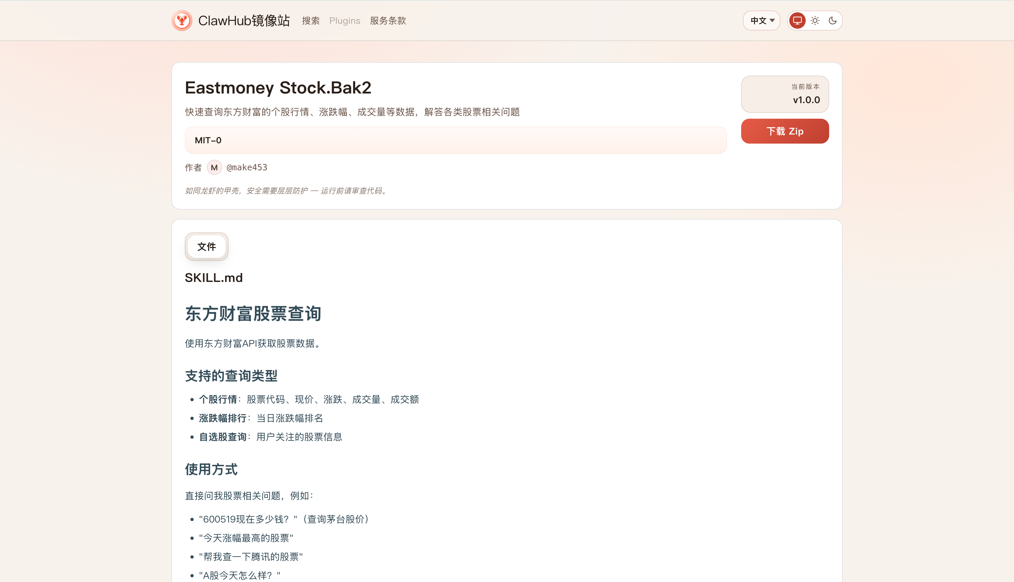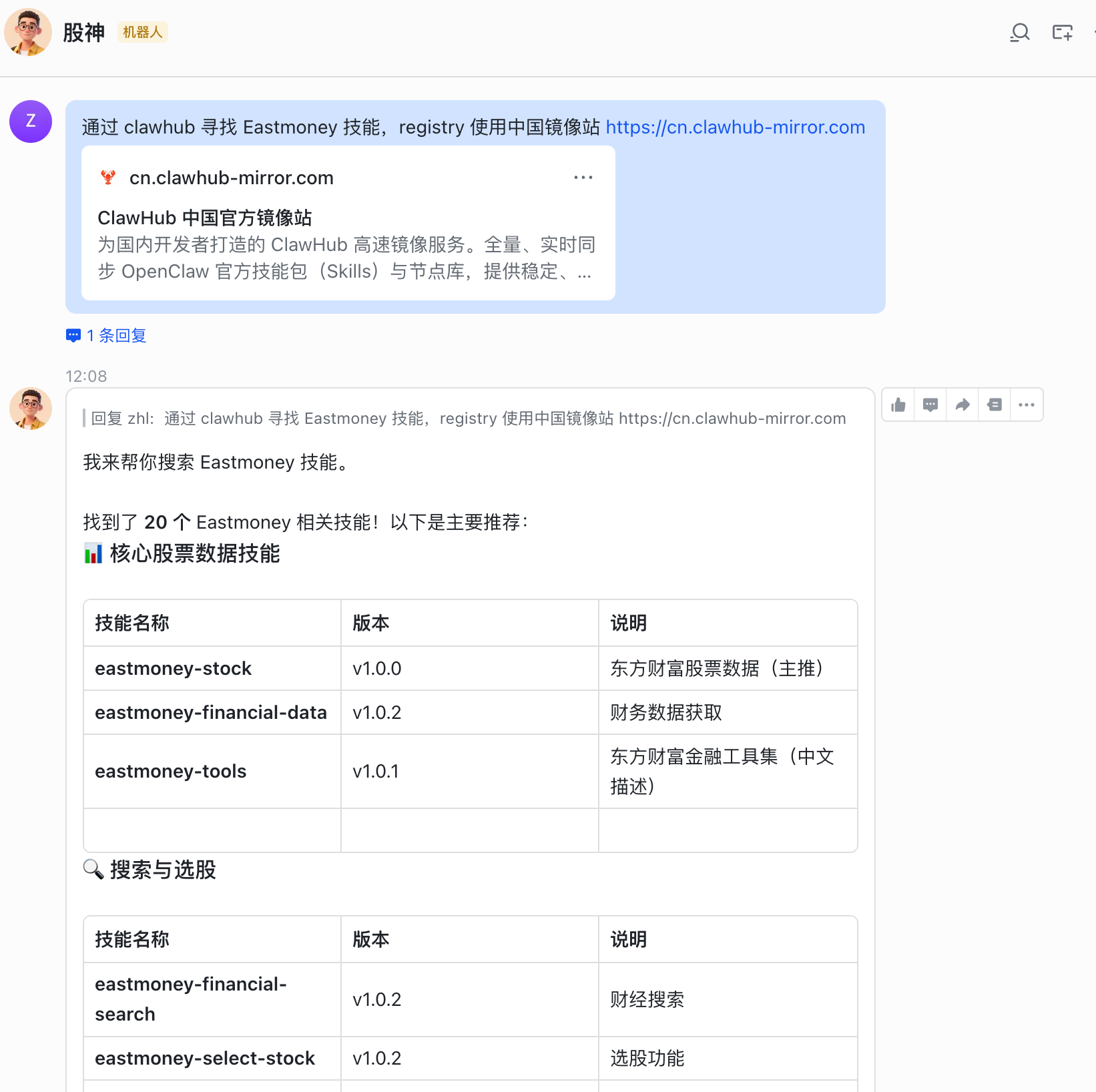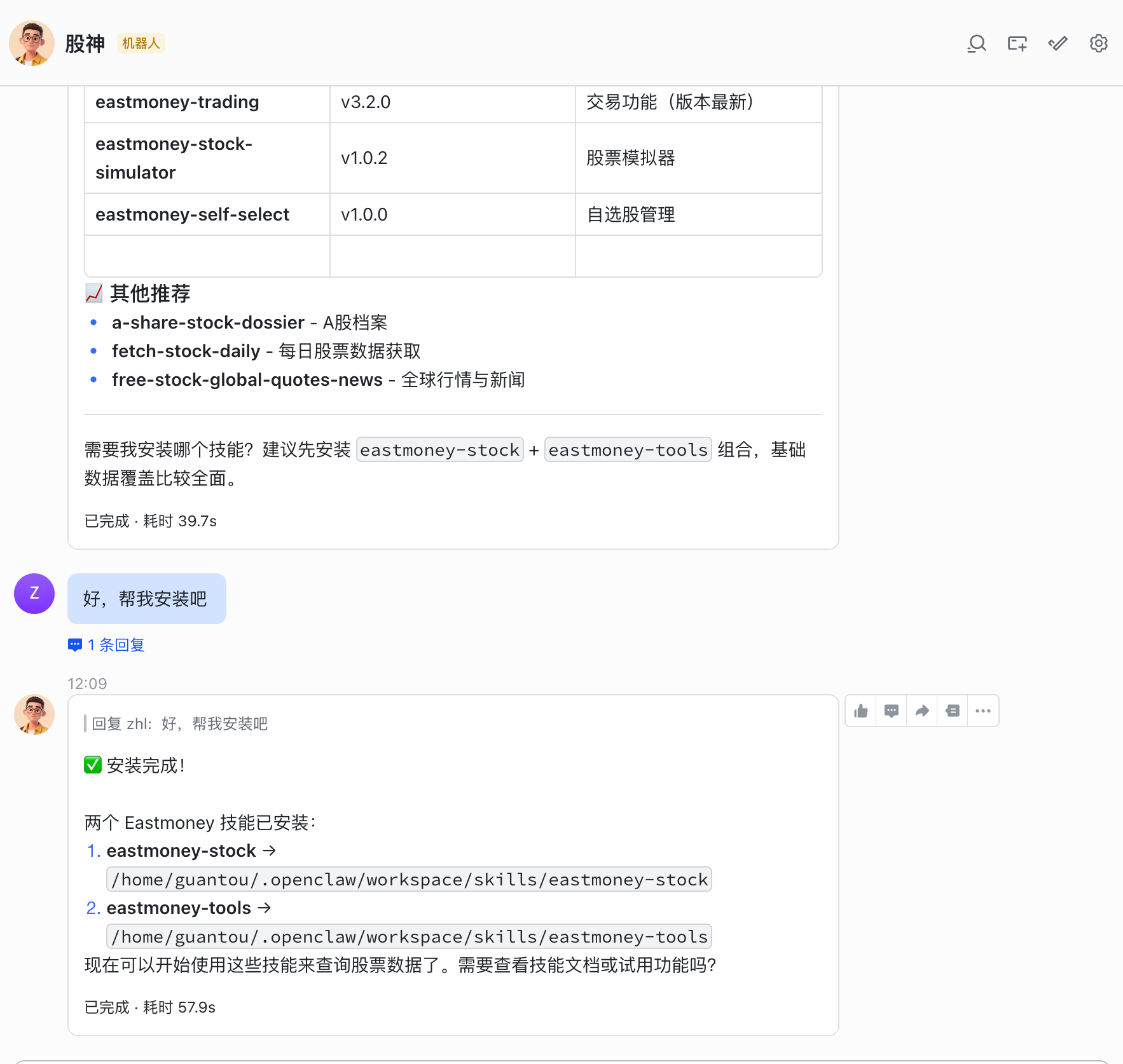 其中,这个Eastmoney是可以替换成你想搜索的技能的。我就拿这个股票行情技能来测试吧。