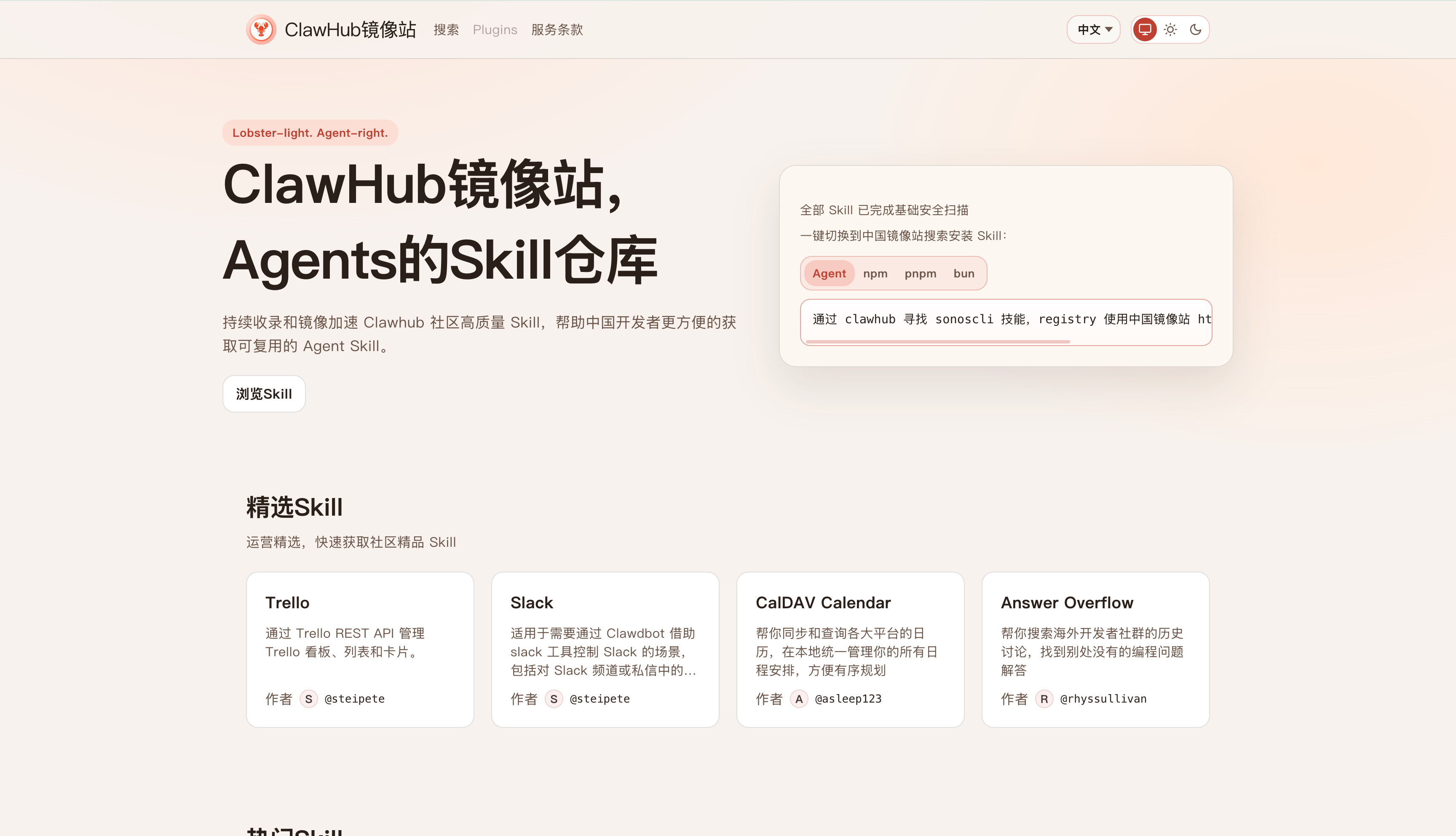 官方镜像站的地址是 https://cn.clawhub-mirror.com/,界面和官方站一模一样,就是对国内用户很友好,做了很完善的汉化,这是其次,重要的是访问速度很快,给龙虾装技能也很丝滑。下面教大家如何接入这个镜像站来给自己龙虾装技能提速。